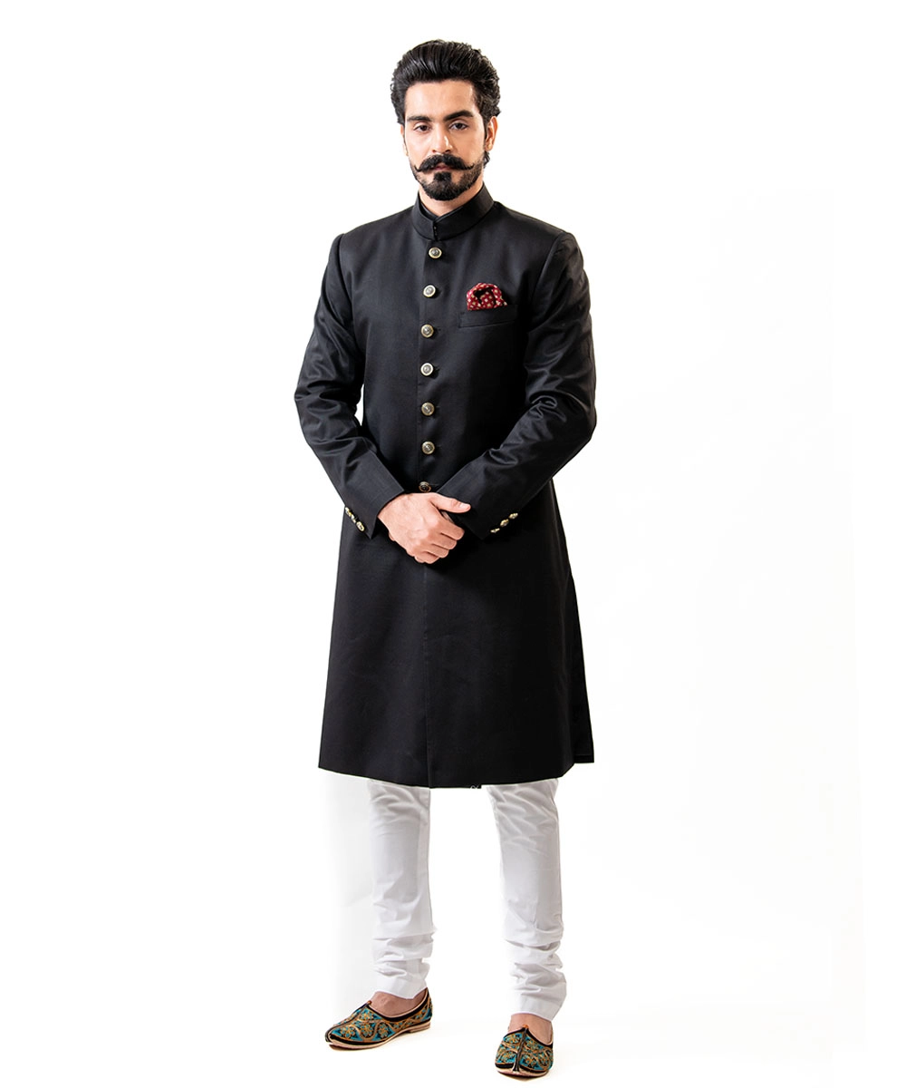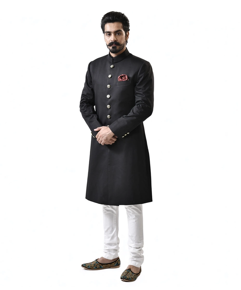 The black Terry Rayon Achkan with a Mandarin/Stand Collar gives a sharp royal look, while the 100% cotton white churidar pajama ensures breathable comfort. Designed for elegance that blends tradition with modern sophistication.