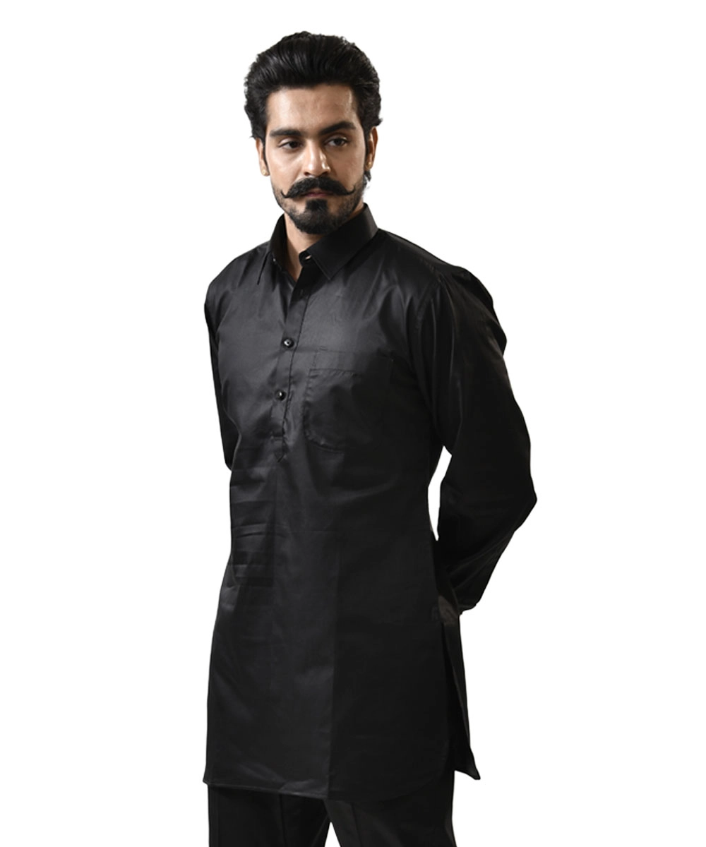 For the man who appreciates comfort with a contemporary twist, this Black Cotton Kurta from Deepee’s Pret features a sharp spread collar that sets it apart from the traditional look.