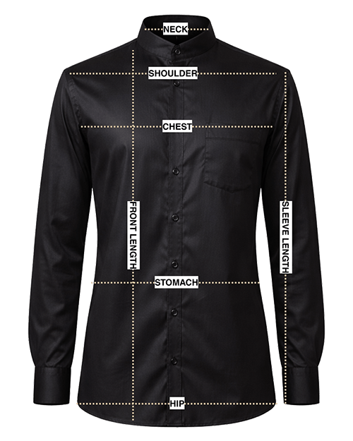 - FRONT LENGTH: Measure from the base of the collar straight down to the bottom hem of the shirt.