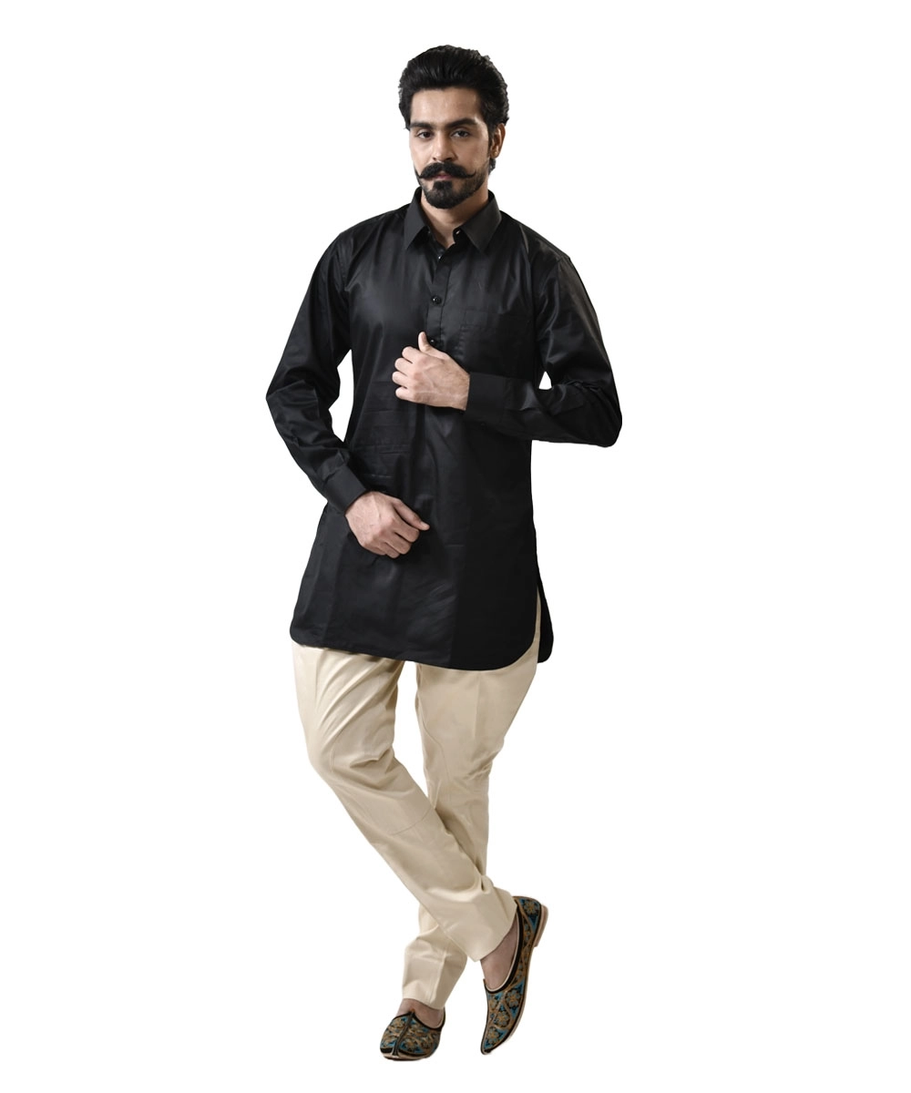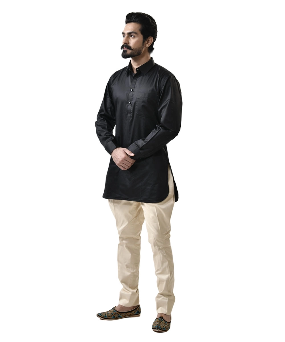 The Mandarin/Stand Collar Black Kameez, tailored from 100% premium cotton, offers sharp minimalism, while the cream cotton breeches add a refined, heritage-inspired touch. Ideal for festive occasions, traditional ceremonies, and evening gatherings, this set redefines everyday ethnic elegance at an affordable price.
