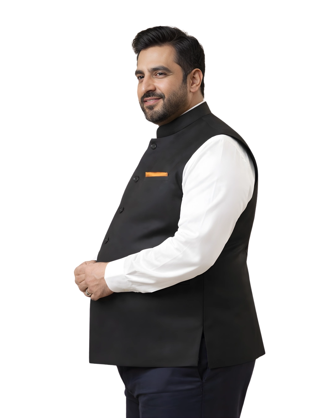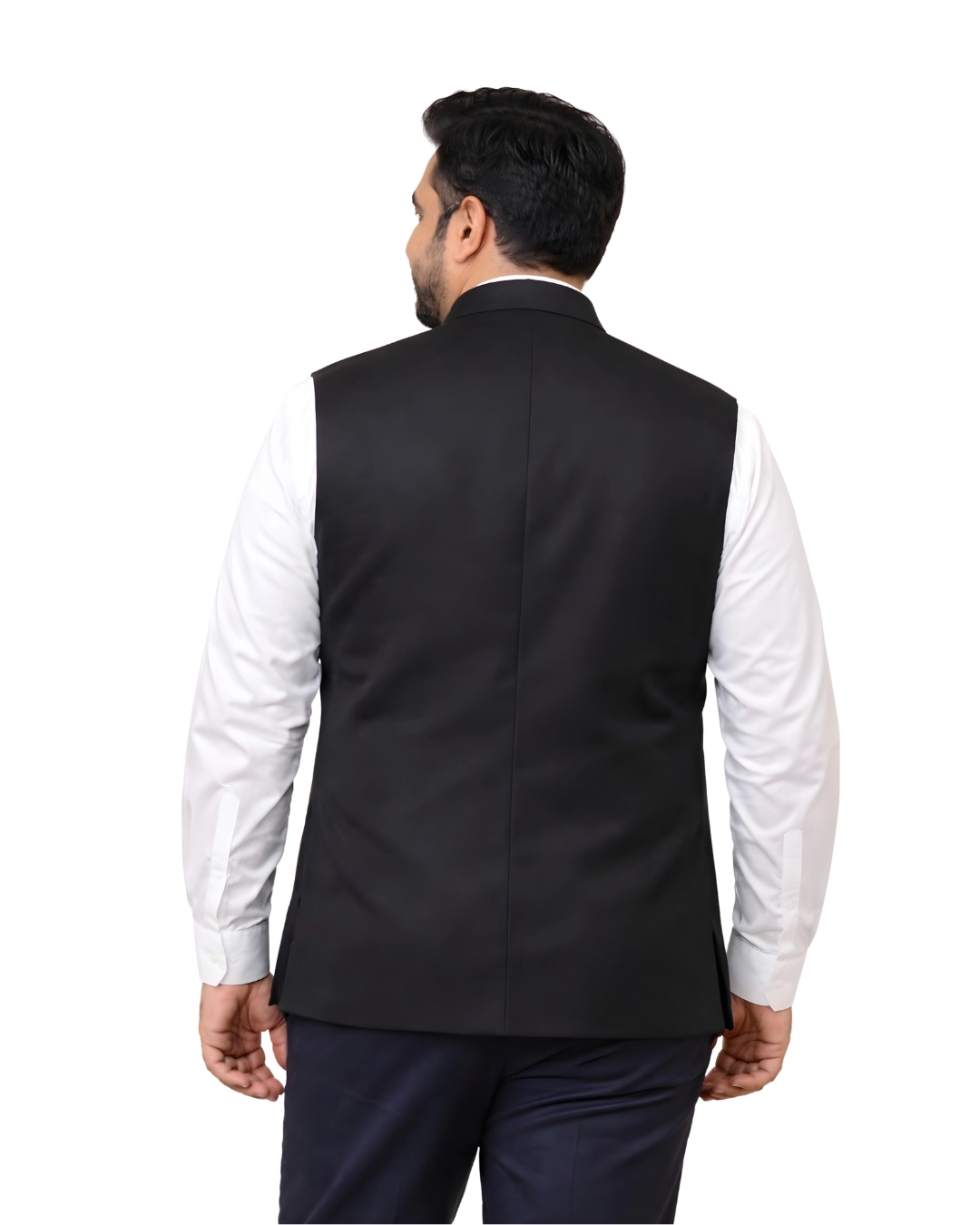 Classic black Nehru jacket (Bundi) designed for Indian men with tummy. Structured shoulders, relaxed midsection fit, and clean front alignment — perfect for festive, wedding, and formal styling.