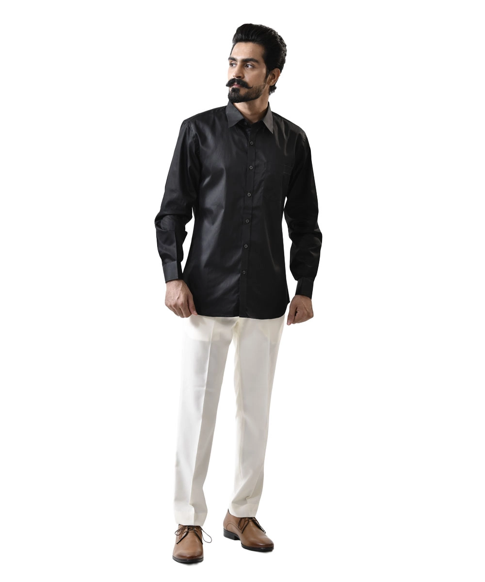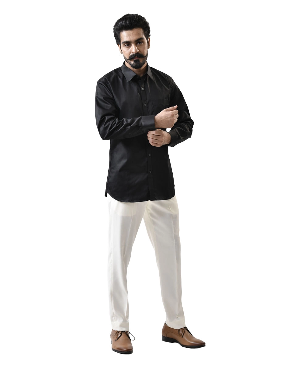 The tailored black shirt features a spread collar and regular full sleeves, perfectly paired with crisp white cotton trousers for a sleek, versatile look. Whether it’s office meetings, festive gatherings, or evening outings, this set delivers affordable luxury with premium comfort.