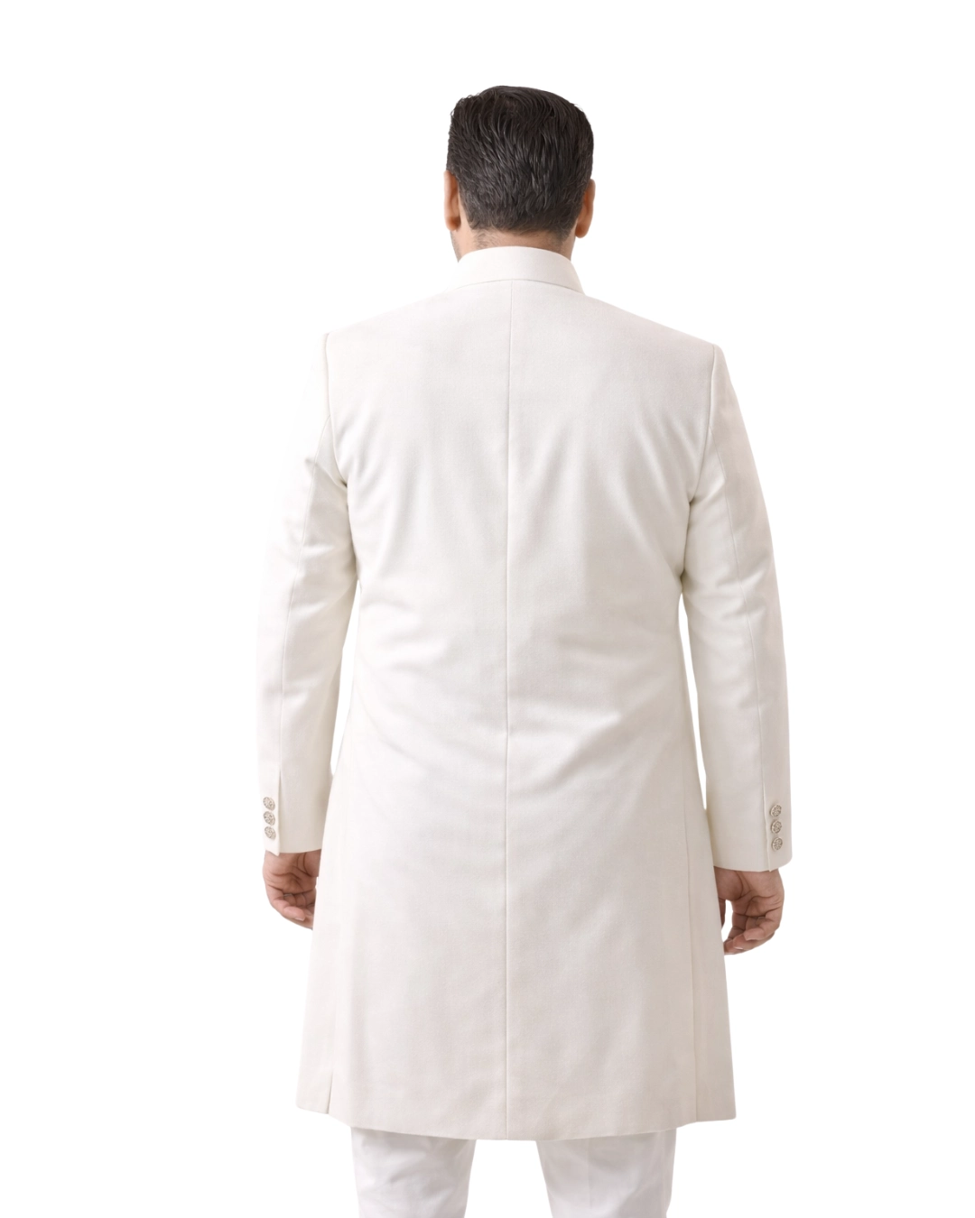 Elegant cream achkan designed for Indian men with tummy. Structured shoulders, relaxed stomach fit, and clean elongated silhouette — perfect for weddings, traditional ceremonies, and festive occasions.