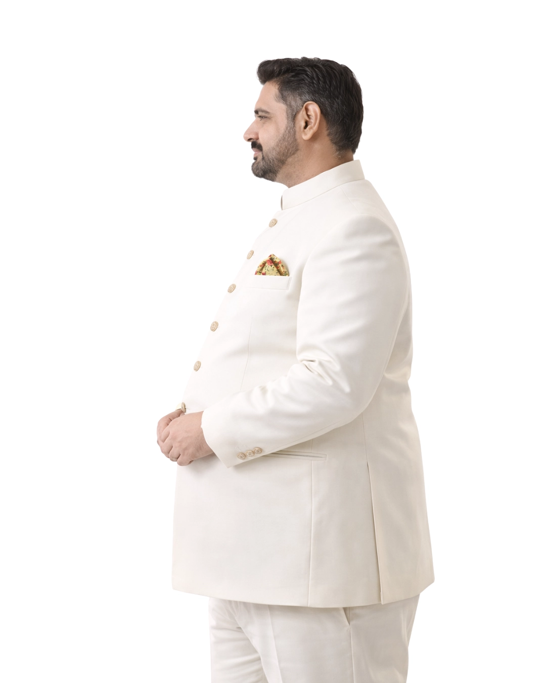 Sophisticated cream bandhgala designed for Indian men with tummy. Structured upper body, relaxed stomach fit, and clean front closure — ideal for weddings, engagements, and festive occasions.