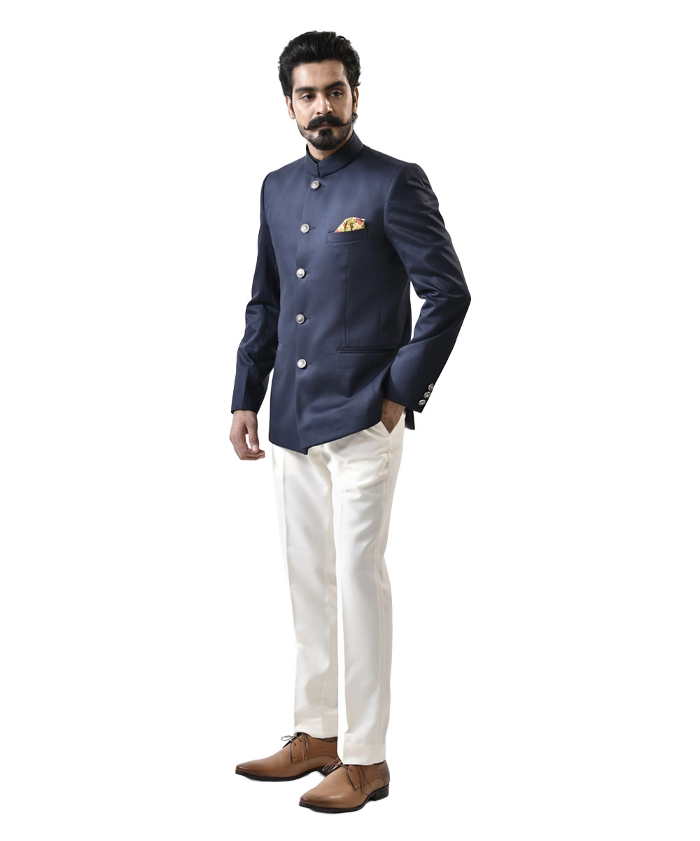 The navy blue Bandhgala in premium Terry Rayon offers a rich and structured look, while the contrasting white cotton trousers bring balance and refinement. With a mandarin collar and precise tailoring, this set is perfect for weddings, receptions, festive occasions, and formal evening gatherings. A pocket square is included for the perfect finishing touch.