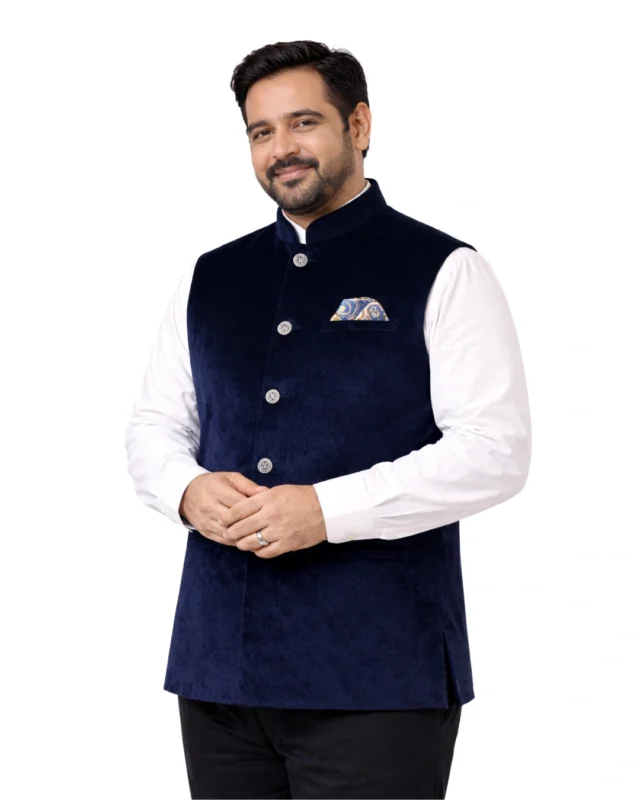 Classic navy blue Nehru jacket designed for Indian men with tummy. Structured upper body, relaxed stomach fit, and smooth button alignment — ideal for weddings, festive functions, and formal occasions.