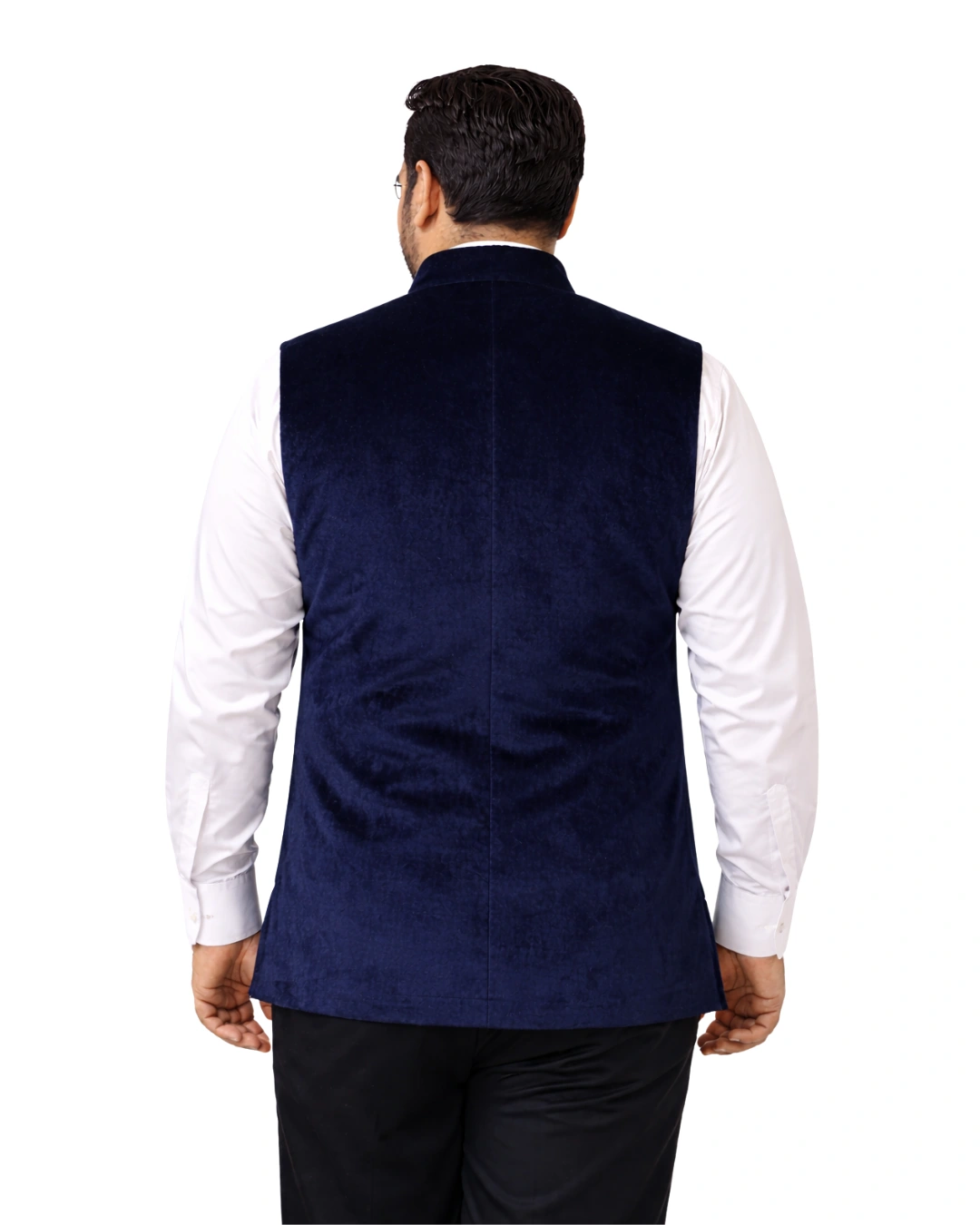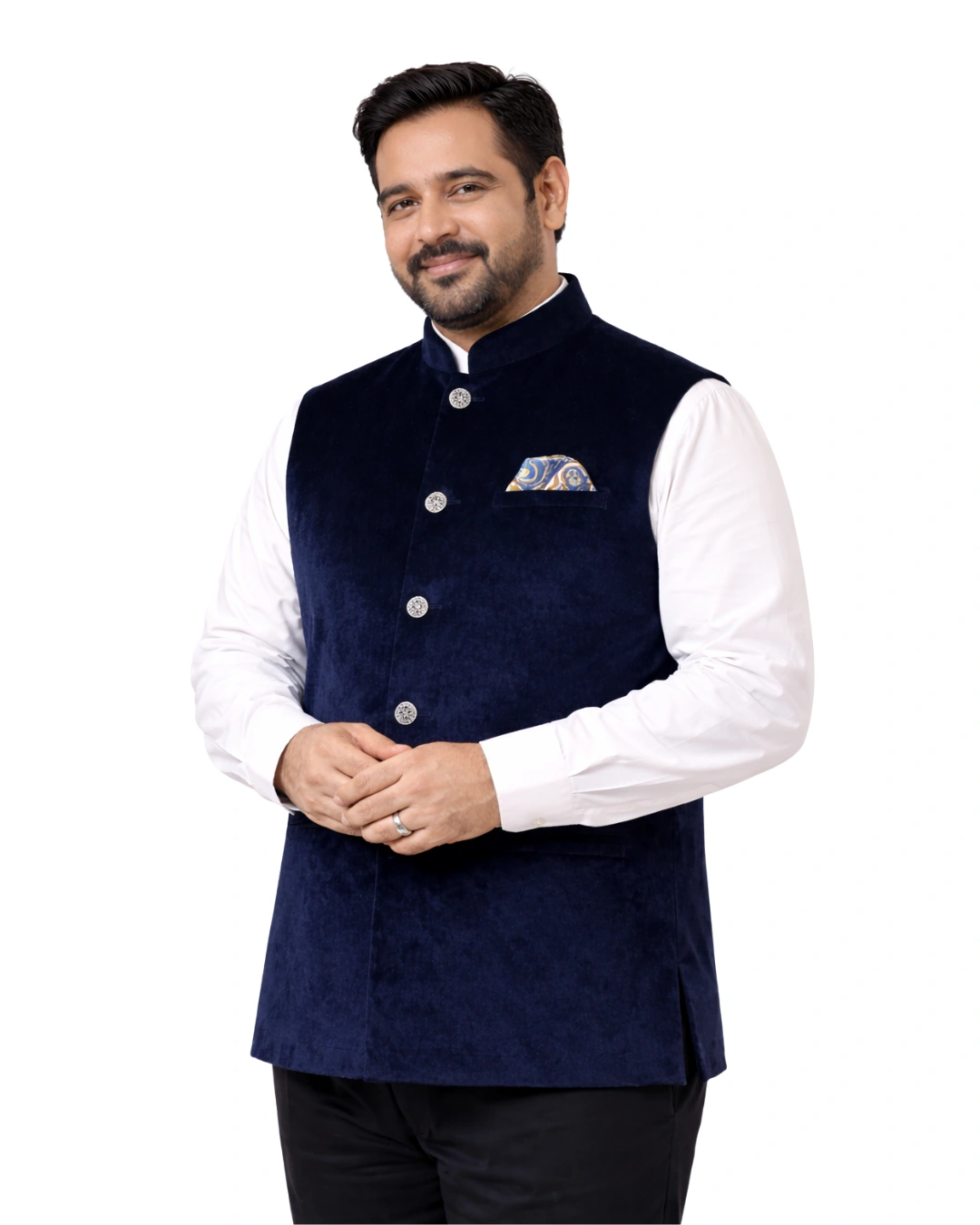 Navy Blue Velvet Nehru Jacket (Bundi) for Men Belly Comfort Fit