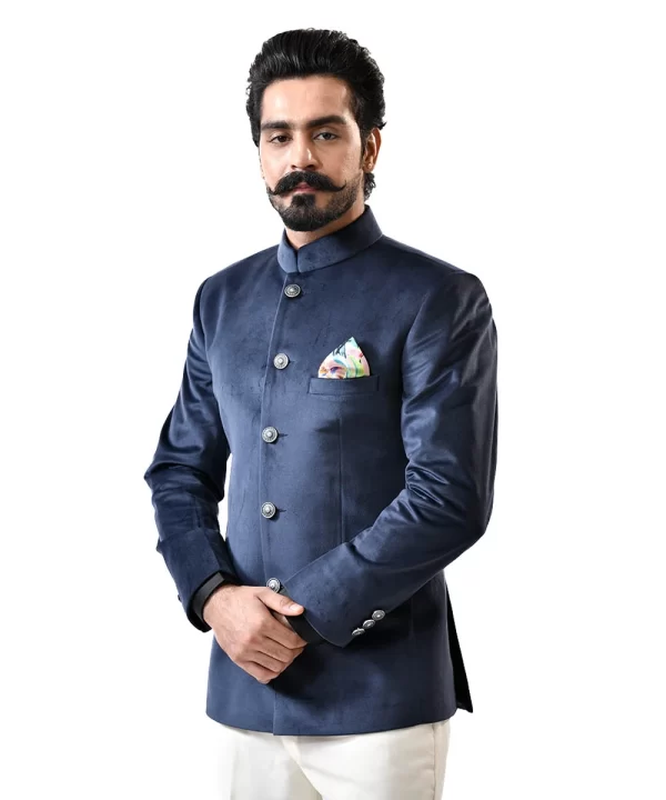Crafted for grandeur, this Navy Blue Velvet Bandhgala from Deepee’s Pret is the definition of festive royalty. Made with rich, soft-touch velvet, it features a classic mandarin/stand collar, regular-fit sleeves, and a structured silhouette that feels just as luxurious as it looks. Perfect for receptions, winter weddings, and evening celebrations, this Bandhgala adds depth, warmth, and unmistakable style to your look. Dry clean only. Package includes 1 Bandhgala jacket.