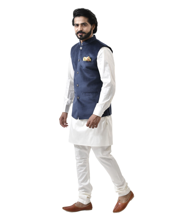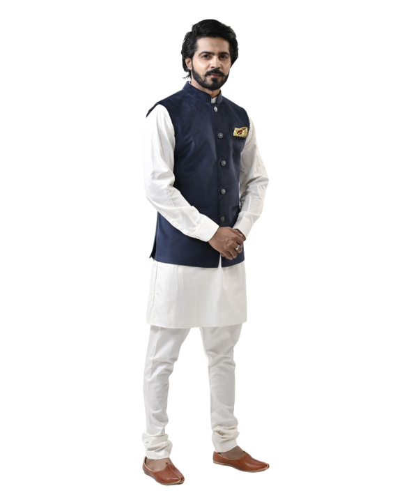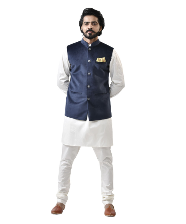 Be the first to review “Navy Blue Velvet Bundi with White Kurta & White Pajama – Bundi Combo Set”